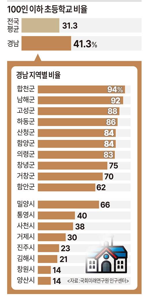 ◇전교생 100명 이하 초등학교 41%= 국회미래연구원 인구센터가 9일 공개한 ‘학령인구 감소에 따른 교육현장 변화 및 정책 제언’ 자료에 따르면 2024년 기준 경남지역 초등학교 소규모 학교(재학생 수 100명 이하) 수는 210개로 도내 전체 초등학교(508개)의 41.3%에 달했다. 전국 초등학교 6183개교 중 소규모 학교 비율은 31.3%(1935개)로 경남보다 10%p가량 낮다.