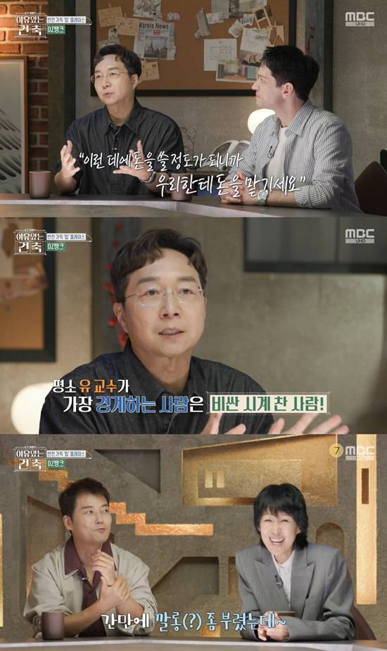 이어 유현준은 "근데 저는 사실 사람을 만날 때 가장 경계하는 사람이 비싼 시계를 찬 사람이다. 비싼 시계로 나에게 신뢰를 주려는 사람들을 안 믿는다"고 전했다. 이에 전현무는 유현준의 눈치를 보더니 갑자기 차고 있던 시계를 빼 모두에게 웃음을 전했다.