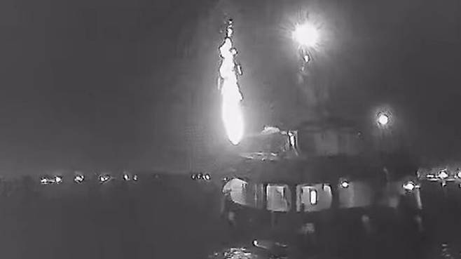 GSF가 소셜미디어에 공개한 영상을 보면 드론으로 추정되는 불타는 물체가 배 갑판 위로 떨어졌습니다.