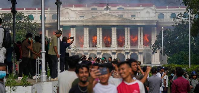 | 네팔 반정부 시위 격화… 불타는 의사당 9일 네팔 수도 카트만두의 총리실 겸 의회 청사가 시위로 불타는 가운데 시민들이 이를 배경으로 셀카를 찍고 있다. 네팔 정부의 소셜미디어 접속 차단을 계기로 반정부 시위가 격화하자, 이날 K P 샤르마 올리 총리가 책임을 지고 사임했다. 정부의 소셜미디어 금지령도 철회됐다. 네팔=AP 뉴시스 |