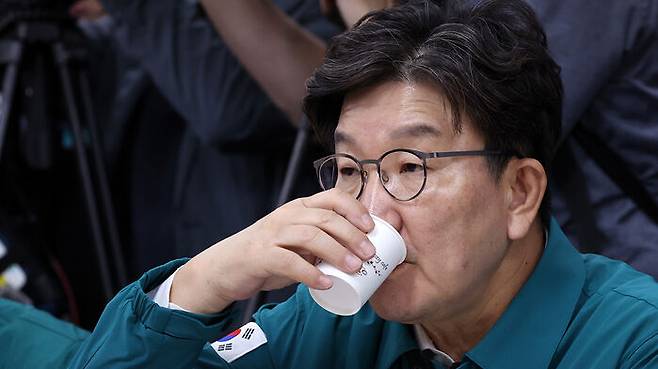 ▲ 국민의힘 권성동 의원이 9일 강원 강릉시청을 방문해 지역 가뭄 피해 상황을 점검하며 물을 마시고 있다.