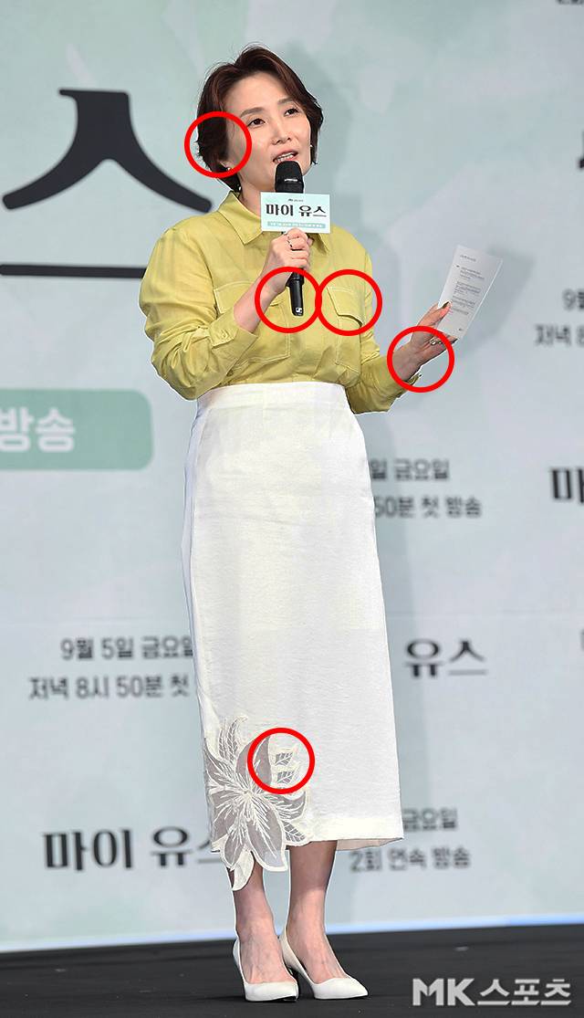 제작발표회 진행을 하고 있는 박령림의 사진에서 다른 부분 5군데를 찾아보세요.