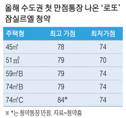 '10억 로또'로 여겨져 632대1의 높은 청약 경쟁률을 보인 서울 송파구 잠실르엘 아파트에서 청약가점 만점자가 나왔다.