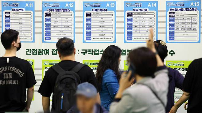 ▲ 7월 16일 오후 경북 구미시 복합스포츠센터에서 열린 '춘하추동 취업 한마당'에서 구직자들이 회사별 채용정보를 살펴보고 있다.