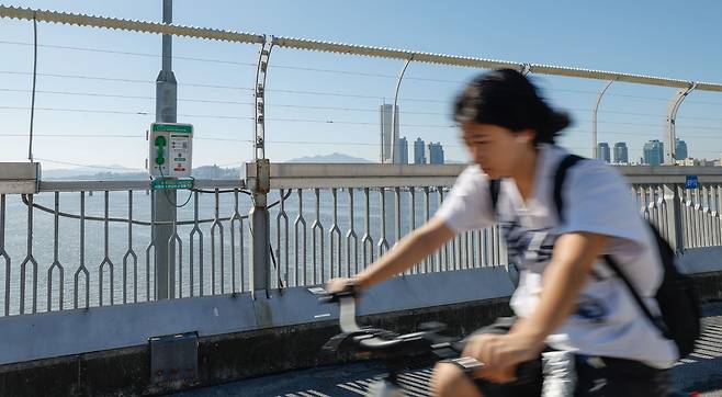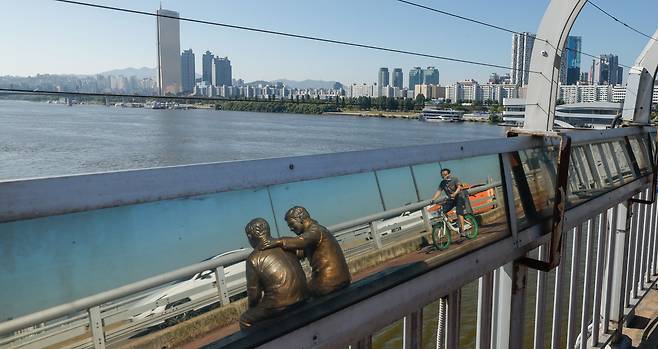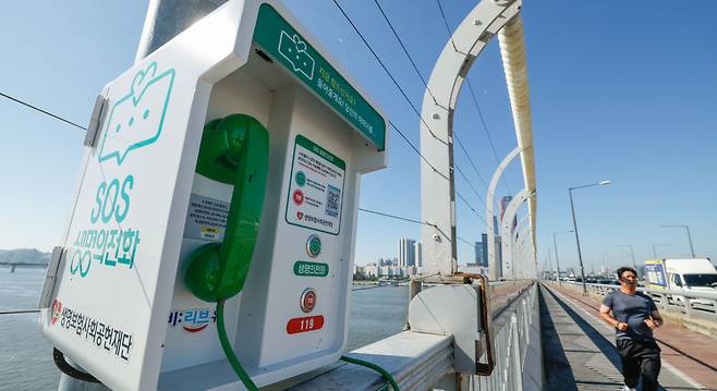 세계 자살예방의 날인 10일 서울 영등포구 마포대교에 '한번만 더' 동상, 폐쇄회로(CC)TV, 생명의 전화가 설치되어 있다. 작년 서울시의회 자료에 따르면 최근 3년간(2022~2024년) 한강다리에서 총 5341건의 투신 시도가 발생했다. 투신 시도가 자주 발생한 한강 다리는 마포대교 26.5%(1428건), 잠실대교 8.3%(448건), 한강대교 7.6%(408건) 순으로 확인됐다.