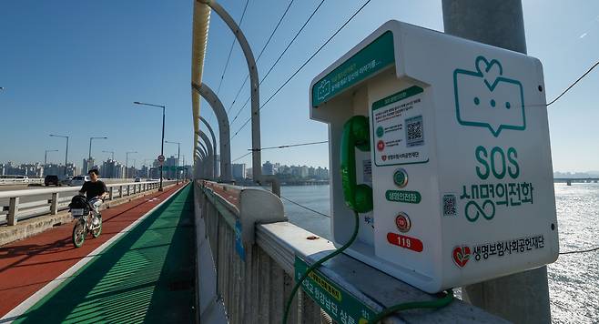 세계 자살예방의 날인 10일 서울 영등포구 마포대교에 '한번만 더' 동상, 폐쇄회로(CC)TV, 생명의 전화가 설치되어 있다.