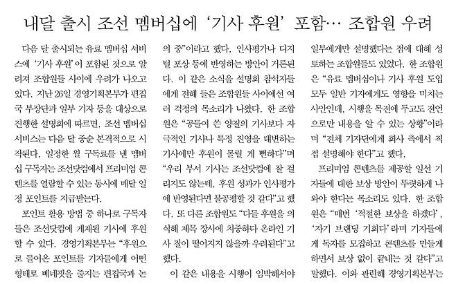 유료 멤버십 서비스 추진 과정에서 ‘기사 후원 포인트’ 등 일부 세부안에 대한 기자들의 우려 목소리가 나오기도 했다. 이날 조선노보에 따르면 경영기획본부는 설명회에서 ‘월 구독료를 낸 멤버십 구독자에게 일정 포인트를 지급’하고, 이 포인트를 활용해 기사를 후원하는 방식 등을 소개했는데, 해당 방침에 대해 “공들여 쓴 양질의 기사보다 자극적인 기사나 특정 진영을 대변하는 기사에만 후원이 몰릴 수 있”고 “후원 성과가 인사평가에 반영 된다면 불공평할 것”이라는 기자들이 지적이 나왔다.