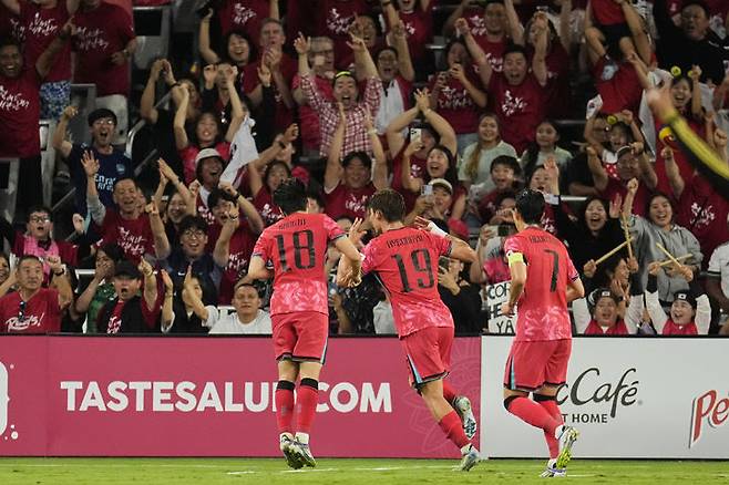 [내슈빌=AP/뉴시스] 오현규(19)가 9일(현지 시간) 미 테네시주 내슈빌의 지오디스 파크에서 열린 멕시코와의 친선 경기 후반 30분 역전 골을 넣은 후 이강인(18), 손흥민(7)과 함께 환호하고 있다. 한국은 후반 추가 시간 동점 골을 허용하면서 멕시코와 2-2 무승부를 기록했다. 2025.09.10.