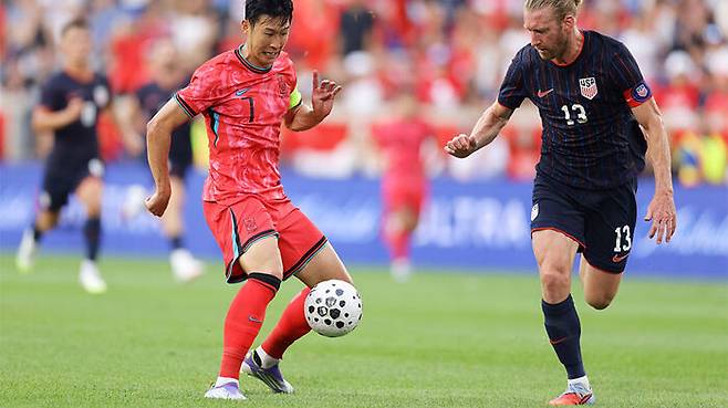 ▲ 9월 6일(현지시간) 뉴저지 해리슨의 스포츠 일러스트레이티드 스타디움에서 열린 국제 친선 경기에서 손흥민과 림이 뛰고 있다.