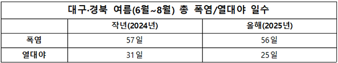 2024년 같은 기간 우리 지역의 열대야 총일수는 31일로 2024년과 비교하면 조금 줄었지만, 2025년에도 여전히 잠 못 이루는 밤이 많았습니다.