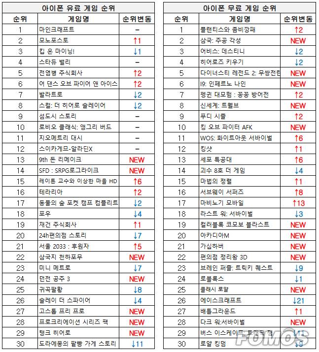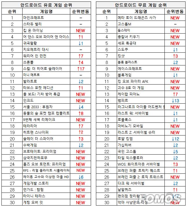 한편, 유료 게임 순위에서는 채굴을 통해 얻은 광물로 장비를 성장 시키고 다시 채굴을 진행하는 클리커류 게임 '킵 온 마이닝'이 3위로 새롭게 차트에 올랐다.