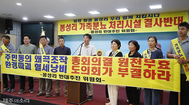 '봉성리 가축분뇨 공동자원화사업 반대추진위원회'는 10일 오후 2시 제주도의회 도민카페에서 기자회견을 갖고 이 같이 주장했다.