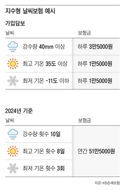 이 상품은 일일 강수량이 10㎜ 이상이면 하루 최대 2만원, 20㎜ 이상이면 2만5000원, 30㎜ 이상이면 3만원 등을 주는 방식이다. 기준치가 높아질수록 정해진 보험금이 올라간다. 80㎜ 이상 비가 내리면 하루 5만원까지 받을 수 있다.