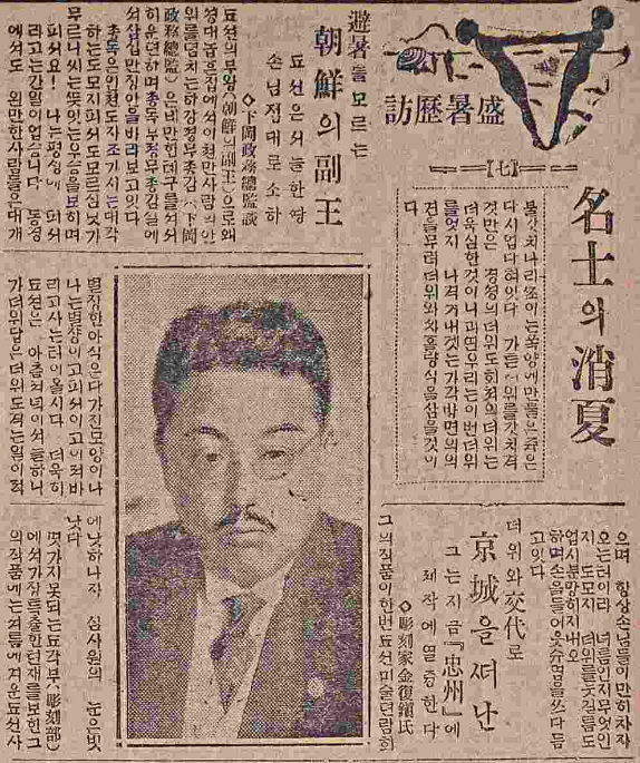 먼저 이왕가(李王家; 구 대한제국 황실)의 의전 및 관련 사무를 담당하는 이왕직(李王職)의 사장 한창수(韓昌洙)의 여름나기다. “나의 직책은 양 전하의 근시(近侍; 웃어른을 가까이에서 모심)를 하는 것이라 양 전하께서 피서를 가시지 않는 때까지는 나도 역시 경성에서 한 걸음도 내어놓기 어려운 사정이 올시다. 다만 집에 돌아가면 뒤뜰에 심은 과수원에 나가서 가위를 들고 가지나 쳐주고 서재에 누워서 한서(漢書)나 읽기로 삼복(三伏)을 그럭저럭 보내는 터이요 하며 가는 눈을 뜻있게 움직인다. ‘손자가 많으시다는데 그 재롱은 아니 보십니까?’ 물으니 한씨는 미소를 띄우며 ‘더위의 아이들은 귀찮아서’ 하며 노인은 고개를 흔든다.” (1925년 8월 8일자)