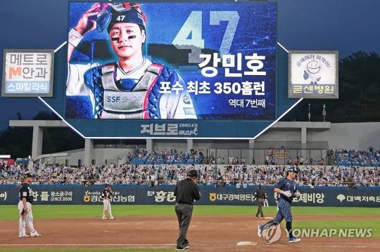 강민호는 7일 한화전에서 시즌 12호 홈런을 쏘아올리며 개인 통산 350홈런을 달성했다. 1982년 KBO 출범 이후 7번째 기록이자 포수로서는 최초다. 박경완 코치도 현역 시절 314홈런에 그쳤던 만큼 의미가 크다.
