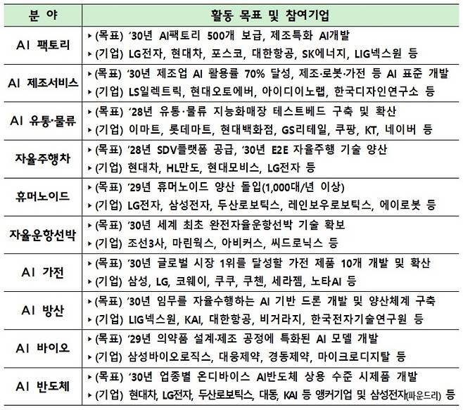 제조 AX 얼라이언스는 AI 팩토리, AI 제조서비스, AI 유통·물류, 자율주행차, 휴머노이드, 자율운항선박, AI 가전, AI 방산, AI 바이오, AI 반도체 등 10개의 분과로 구성된다.