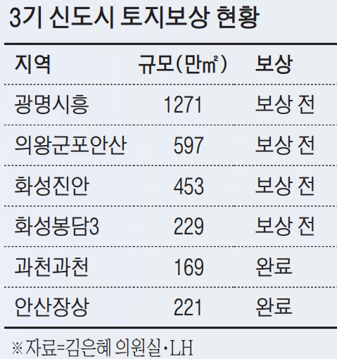 10일 김은혜 국민의힘 의원이 확보한 자료에 따르면 LH가 사업 시행을 맡은 3기 신도시 후속 공공택지지구 6곳 가운데 4곳은 아직 토지 보상이 하나도 이뤄지지 않은 것으로 조사됐다. 광명시흥(1271만㎡), 의왕군포안산(597만㎡), 화성진안(453만㎡), 화성봉담3(229만㎡) 지구가 그 대상이다.