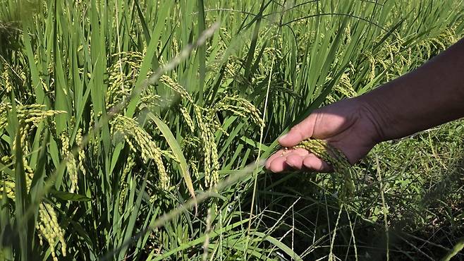 | ▲ 벼 이삭 한참 고개를 숙이고 익어야 할 벼 이삭이 아직도 파랗게 서 있다. 물 부족으로 생장이 멈춘 듯한 모습이 들녘의 척박한 현실을 그대로 보여준다. |