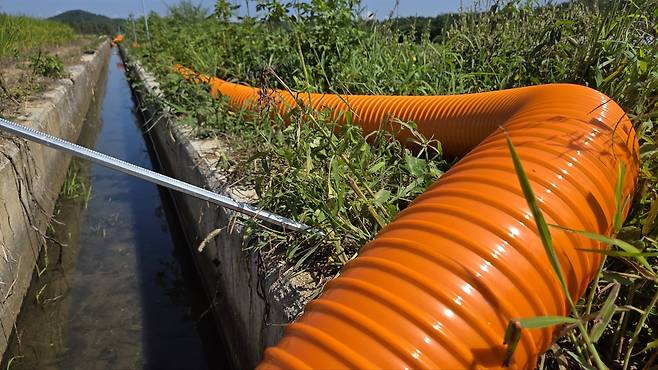 | ▲ 장현저수지에서 하수관로를 통해 물을 끌어올리는 통로. 설치된 파이프들이 줄지어 늘어서 있지만, 늦벼가 필요한 충분한 물을 공급하기에는 한계가 있어 농민들의 걱정이 깊어지고 있다. |