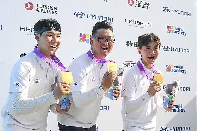 | 2025 세계양궁선수권대회 리커브 남자 단체전 결승전이 10일 광주시 동구 5·18민주광장에서 열려 금메달을 차지한 이우석·김우진·김제덕(사진 왼쪽부터)이 메달을 들고 기뻐하고 있다./김애리 기자·조영권 인턴기자 |