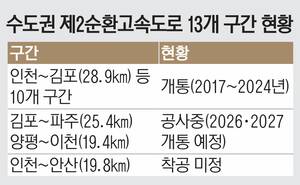 제2순환선은 김포~파주~양주~포천~화도~양평~이천~오산~동탄~봉담~송산~평택~시흥~안산~인천을 연결하는 순환도로로, 전체 14개 구간(260.5㎞)으로 이뤄졌다. 이 가운데 인천~안산 구간 1개 노선만 착공 일정이 불투명하다. 지난해 파주~양주 구간이 개통했고, 양평~이천 구간과 김포~파주 구간은 각각 2026년, 2027년 개통을 목표로 공사가 진행 중이다.