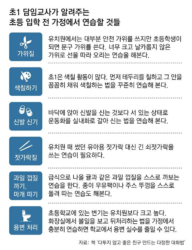 경기 지역 초등학교에서 근무하는 24년 차 교사 ‘초등샘Z’(필명)를 인터뷰해 초등학교에 입학하기 전 집에서 연습할 수 있는 친구, 선생님과의 대화법을 물어봤다. 11년째 1학년 담임을 맡고 있는 초등샘Z는 책 ‘다투지 않고 좋은 친구 만드는 다정한 대화법’을 썼고, 초등학교 1학년에게 맞는 대화법에 대해 강의도 하고 있다.