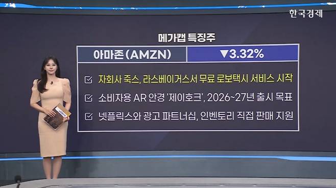 아마존 (AMZN) 아마존이 잇따라 새로운 행보를 내놓고 있습니다. 먼저, 아마존이 소유한 로보택시 업체 죽스가 라스베이거스 스트립과 인근 지역에서 무료 서비스를 시작했는데요. 주 정부의 운임 징수 승인 절차가 진행되는 동안, 웨이모와 테슬라가 있는 시장에서 서비스 입지를 넓혀가고 있는 모습입니다. 또 아마존은 소비자용 증강현실 안경도 준비 중입니다. 내부 코드명은 ‘제이호크’로, 마이크와 스피커, 카메라, 그리고 한쪽 눈에 풀컬러 디스플레이를 탑재할 예정인데요. 출시 시점은 2026년 말이나 2027년 초로 계획돼 있습니다. 이와 함께 넷플릭스와 광고 파트너십도 체결했습니다. 앞으로 마케터들은 아마존의 광고 플랫폼을 통해 넷플릭스 인벤토리에 직접 접근할 수 있게 됩니다. 한편, 넷플릭스는 최고제품책임자 유니스 킴이 회사를 떠난다고 밝혔습니다.