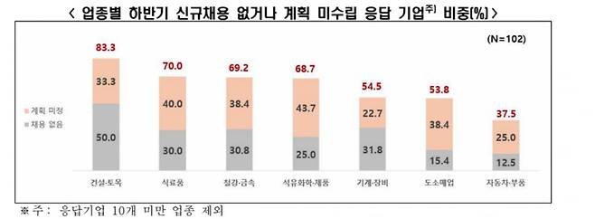 올해 하반기 채용 ‘없음’이라고 응답한 기업(24.8%)은 작년 하반기(17.5%)보다 7.3%p 증가했고 채용계획 ‘미정’이라고 응답한 기업(38.0%)은 작년 하반기(40.0%)보다 2.0%p 감소했다.