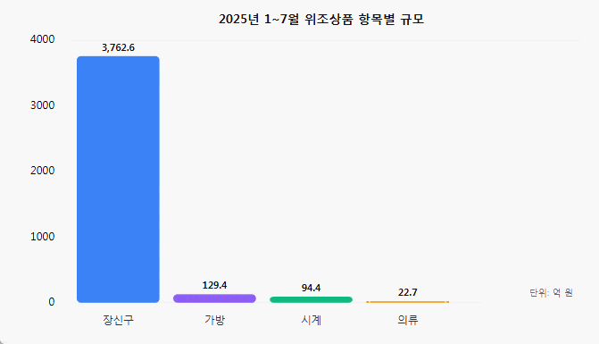 허종식 더불어민주당 의원실이 특허청으로부터 제출받은 위조상품 단속 현황 자료에서도 지난 1월부터 7월까지 적발된 가품을 정품 가액 가치로 환산하면 4061억9000만원에 달한다. 최근 5년 사이 최대 규모다.