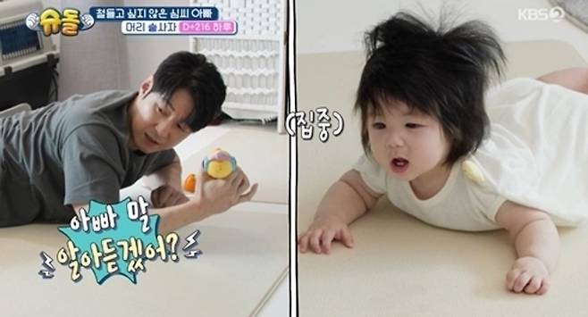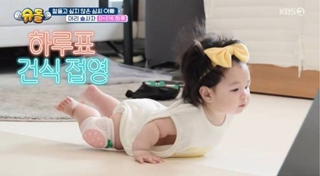 심형탁은 "하루가 배밀이하는 방법을 몰라서 못 하는 것 같아서 가르쳐주려고 한다"며 직접 바닥을 기며 시범을 보였다.