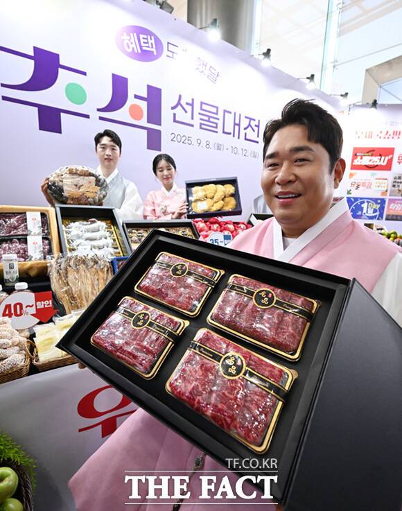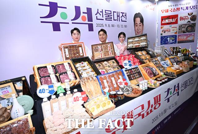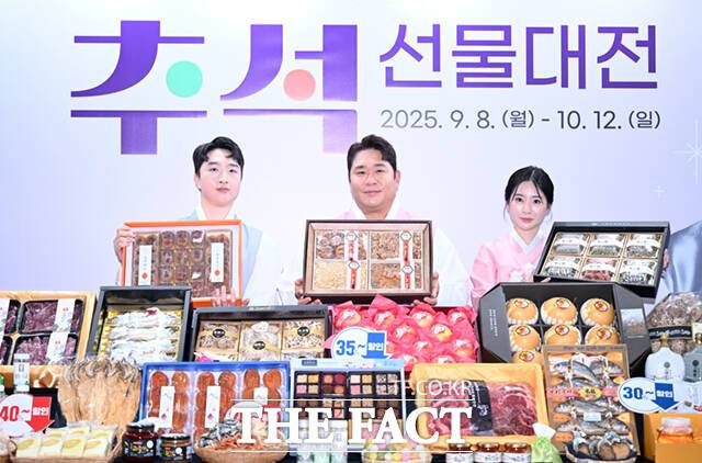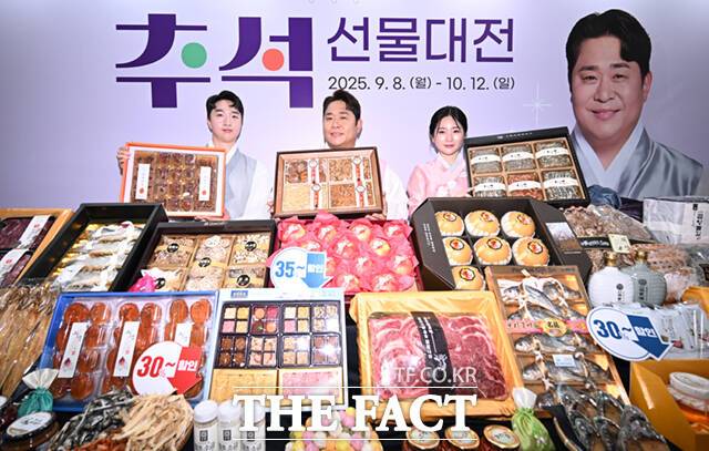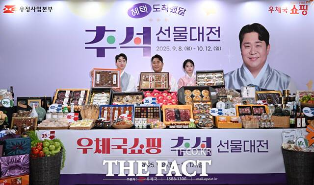 [더팩트ㅣ이새롬 기자] 우체국쇼핑이 추석을 맞아 전국 우수 특산물 할인 판매에 나선 11일 서울 중구 서울중앙우체국에서 홍보 모델인 개그맨 문세윤이 모델들과 함께 추석 선물세트를 선보이고 있다.
