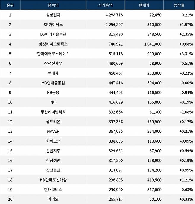 한편 시가총액 20위권 종목들은 두산에너빌리티(034020) ▼2.08%, 셀트리온(068270) ▲0.12%, NAVER(035420) ▲0.21%, 한화오션(042660) ▼0.09%, 신한지주(055550) ▲0.59%, 삼성생명(032830) ▲0.19%, 삼성물산(028260) ▲0.99%, HD한국조선해양(009540) ▲1.21%, 현대모비스(012330) ▼0.63%, 카카오(035720) ▲0.33% 등의 성적을 기록하고 있다.