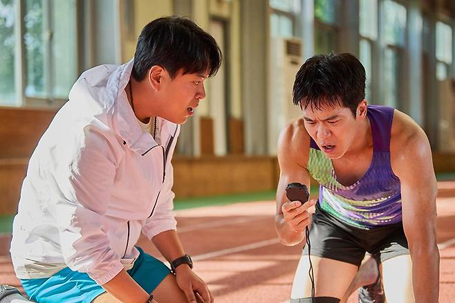 영화 중후반부에서는 구영이 시각 장애인 달리기 선수인 민지의 손을 잡고 함께 트랙 위를 달리는 장면이 나온다. 그는 자신의 옆에 있는 사람이 구영인지도 모른 채, 국내 최고의 선수와 함께 달려보는 것이 평생소원이라고 고백하는 지점이다. 이 장면은 단순한 동정이나 위로의 순간을 마련하기 위해 존재하지 않는다. 구영이 지금껏 자신의 인생을 걸다시피 달려온 시간이, 누군가에게는 인생의 빛과 같은 울림이 될 수 있다는 사실을 보여준다. 이 고백을 들으며 구영은 한 방 크게 얻어맞은 듯 허탈하게 웃는다. 그 웃음에는 복합적인 감정이 뒤섞여 있다. 오로지 기록과 성취를 향해 달려온 시간이 무너지는 동시에, 달리기가 처음 지녔던 순수성과 해방감이 다시 깨어나는 순간이어서다.