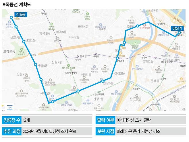 이때 나온 예타 최종 보고서의 내용을 보자. "… 현시점에서는 (양천구의) 순증하는 인구 규모를 파악하는 데에 어려움이 있다. 아직 개발계획 단계에 미치지 못해 조사의 수요 분석에는 반영되지 않았다…." 예타란 문턱을 넘지 못했지만, '목동선'의 수요는 여전하다. 특히 양천구 주민의 바람이 크다. 목동선 중 1개역(당산역)을 제외한 나머지 11개역이 모두 양천구에 있어서다.
