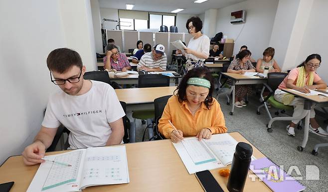 [인천=뉴시스] 전진환 기자 = 11일 오전 인천 남동구 의 한 아파트 관리사무실에서 한글을 공부하는 영주귀국 사할린한인들이 한글을 공부하고 있다.
