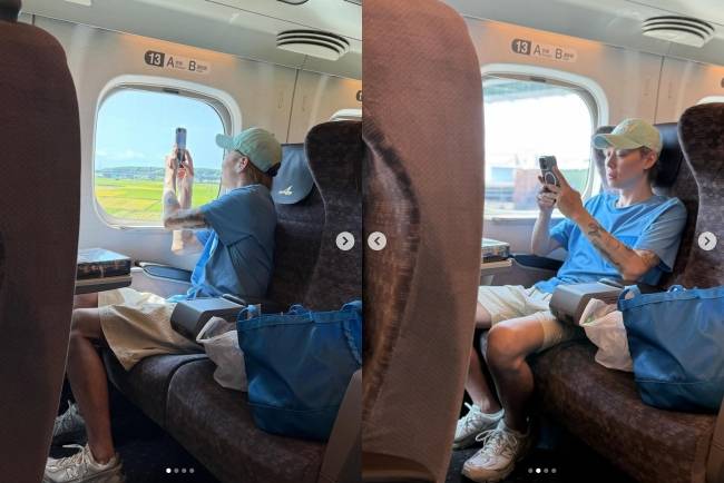 공개된 사진에는 기차를 타고 이동 중인 박유천의 모습이 담겨 있었다. 박유천은 창가에 앉아서 아름답고 평화로운 풍경을 사진으로 남기며 웃고 있다. 하늘색 티셔츠에 베이지색 반바지를 입고 운동화를 신은 편안한 차림으로, 왼팔에 가득한 문신이 눈길을 끈다.