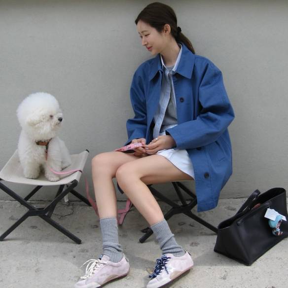 별 생각 없이 '툭' 걸친 것 같은데 내가 찾던 그 느낌이라 똑같이 따라 입고 싶어지는 매직. 흔하디 흔한 트렌치 코트 같지만 흰 티에 반바지라는 심하게 베이직한 아이템도 느낌 있게 입는 공효진이 가진 힘입니다. 얇은 소재로 허리끈을 힘껏 조이면 마치 원피스 같은 실루엣이 연출되는 트렌치 코트에 빨간 양말과 블랙 스니커즈로 포인트를 준 센스를 기억하세요.