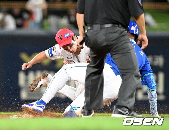 KIA의 1점 차 리드가 이어지던 8회, 삼성은 결정적인 반격 기회를 잡았다. 선두타자 디아즈가 우익수 옆으로 빠지는 안타를 때렸다. 타구가 깊숙이 굴러가는 것을 확인한 디아즈는 속도를 올려 2루로 쇄도했다. 태그보다 발이 먼저 닿았지만 KIA 유격수 박찬호가 속도를 이기지 못한 주자의 몸이 베이스에서 떨어졌다고 판단해 다시 태그를 시도 했다. 심판은 아웃을 선언했다.