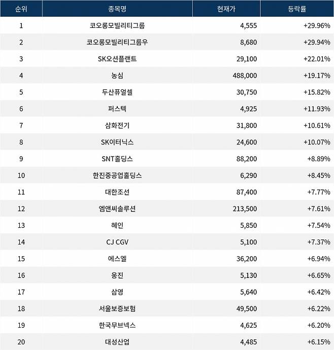 이어 상승률 2위 코오롱모빌리티그룹우(45014K)는 주가가 +29.94% 폭등하며 종가 8,680원에 상승 마감했다. 상승률 3위 SK오션플랜트(100090)의 주가는 29,100원으로 +22.01% 폭등하며 강세를 보였다. 상승률 4위 농심(004370)은 +19.17% 급등하며 488,000원에 마감했다. 상승률 5위 두산퓨얼셀(336260)은 +15.82%의 급등세를 타고 종가 30,750원에 마감했다.
