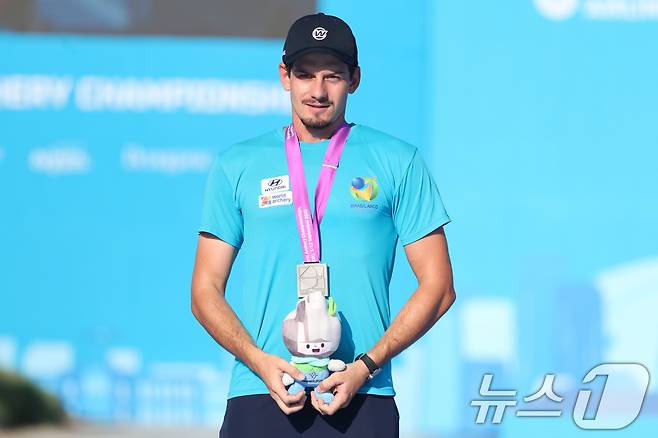 (광주=뉴스1) 이승현 기자 = 11일 오후 광주 동구 5·18민주광장에서 열린 2025 세계양궁선수권대회 리커브 남자 개인전 시상식에서 브라질 마커스 알메이다가 은메달과 기념 인형을 들고 있다. 2025.9.11/뉴스1