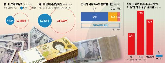 당장 한국과 일본의 체급부터가 다르다. 일본은 과거 버블경제 시절부터 장기간 해외투자를 지속해 해외 금융자산이 많은 국가로 통한다. 실제 일본의 순대외금융자산은 지난해 말 기준 3조 6200억 달러로 한국(올 2분기 말 기준)의 1조 302억 달러보다 3배 이상 많다.