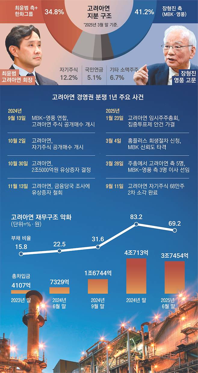 경영권 분쟁은 지난해 9월 13일 MBK·영풍 측이 고려아연 지분 공개매수를 통해 최윤범 회장 측을 상대로 전쟁을 선포하면서 시작했다. MBK·영풍 측이 적대적 인수·합병(M&A) 작업을 시작하며 내건 명분은 ‘거버넌스 개선’과 ‘기업가치 제고’였다.