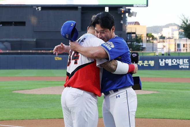 오승환(43·삼성)과 최형우(42·KIA)는 삼성 왕조 시절의 주역으로 1년차 선후배다. 어느덧 리그 최고참이 된 최형우는 은퇴를 앞둔 오승환에게 헌사를 바치며 눈물을 흘렸다. 오승환은 90도로 인사하며 고마운 마음을 표했다.