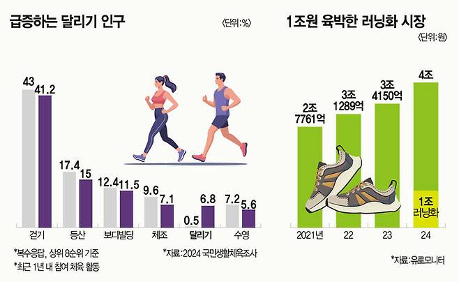 러닝의 인기는 통계에서도 드러난다. 국민체육진흥공단이 발표한 ‘2024 국민생활체육조사’에 따르면, 최근 1년간 참여 경험이 있는 체육활동(복수응답 기준) 중 ‘달리기’가 0.5%에서 6.8%까지 늘었다. 상위 8개 운동 중 가장 가파른 증가세다. 걷기(43%→41.2%), 등산(17.4%→15%), 수영(7.2%→5.6%) 같은 운동은 모두 감소했다.