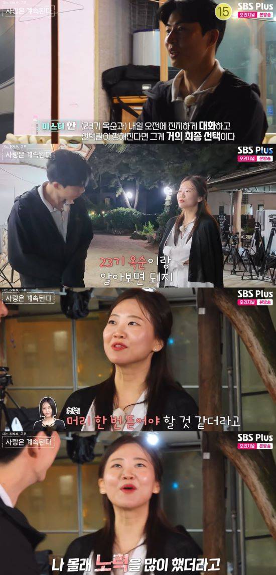이어 23옥순과 미스터 한이 서로 첫인상 투표에서 1위로 뽑은 것을 떠올리며 불안함을 드러냈다. 또 "미스터 한이 나한테 집중하는 동안 23기 옥순도 (미스터 한에게) 노력을 했다더라"라고 털어놨다.