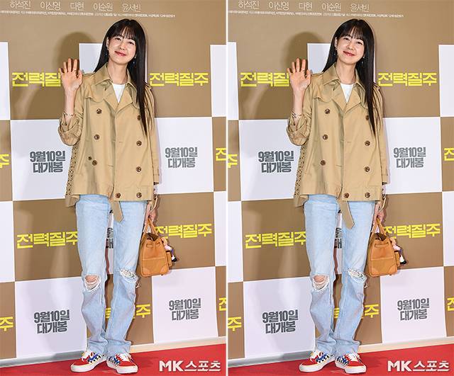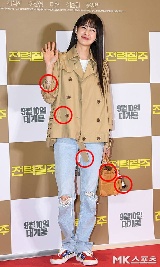 이날 시사회에서 이요원은 베이지 컬러의 재킷에 찢어진 청바지, 그리고 컬러풀한 스니커즈를 매치했고, 핸드백에 큼지막한 인형 키링을 달아 한층 젊은 패션으로 포토월에 섰습니다.