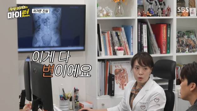엑스레이 촬영 후 원장은 박지현에게 "어떻게 이렇게 될때까지 병원을 안오셨을까요?"라며 "지금 보이시는게 배를 찍어놓은 엑스레이 사진인데 여기서부터 여기까지 뭐가 잔뜩 차있잖아요? 이게 다 변이에요"라고 충격적인 엑스레이 결과를 전했다.