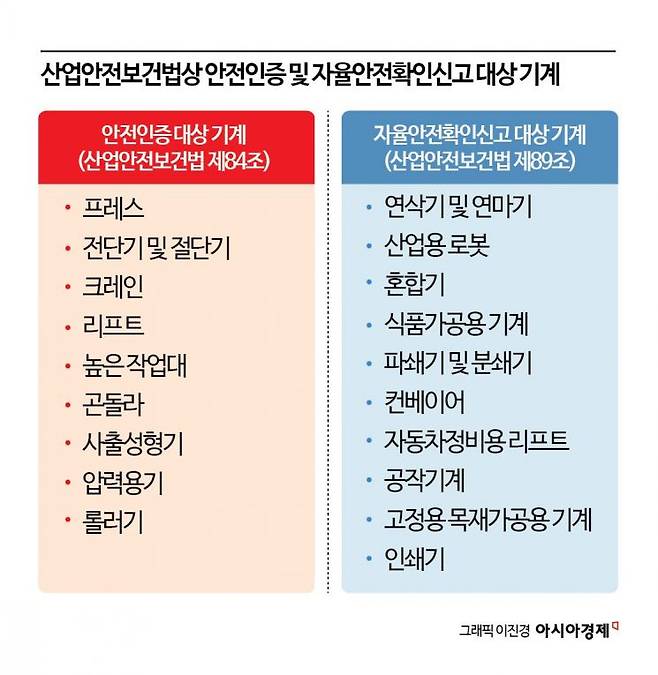 현행법은 기계 안전점검의 의무를 건설업에 초점 맞추고 있다. 산안법 제84조에 따라 프레스·크레인·높은 작업대·곤돌라·리프트 등 건설현장에서 흔히 볼 수 있는 기계들은 의무적으로 고용노동부가 지정한 인증기관을 통해 예비심사, 서면심사, 기술능력 및 생산체계 심사, 제품심사 등을 거쳐 안전인증을 받아야 한다. 아울러 안전인증 기관은 2년에 1회 이상 해당 기계가 안전인증 기준을 지키고 있는지 확인해야 한다.