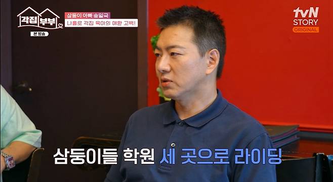 이날 송일국은 아내와 각집살이 중이라며 아내는 지방 발령으로 지방에서 근무 중이라고 밝혔다. 세 아이는 모두 송일국이 케어하고 있는 것.