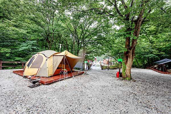 야영데크는 6명까지 이용 가능하며, 계곡 주위로 8개의 데크가 있다. 자갈 바닥에 개별 나무데크가 있다. 화로대를 사용한 불멍은 금지되어 있다. 광장 형태이지만 아름드리나무가 에워싸고 있어 직사광선 절반 정도만 든다. 계곡을 낀 1~4번 데크는 물소리가 숙면에 시끄러울 수도 있다. 데크는 과거 3m×3m로 좁았으나, 리모델링 후 6m×4m로 넉넉한 사이즈로 바뀌었다. 캠핑 사이트 옆에는 차량 진입 불가, 주차장에서 50m가량 짐을 옮겨야 한다. 평지라 비교적 어렵지 않다. 화장실, 개수대, 샤워장(유료)도 새로 지어 깔끔하다.